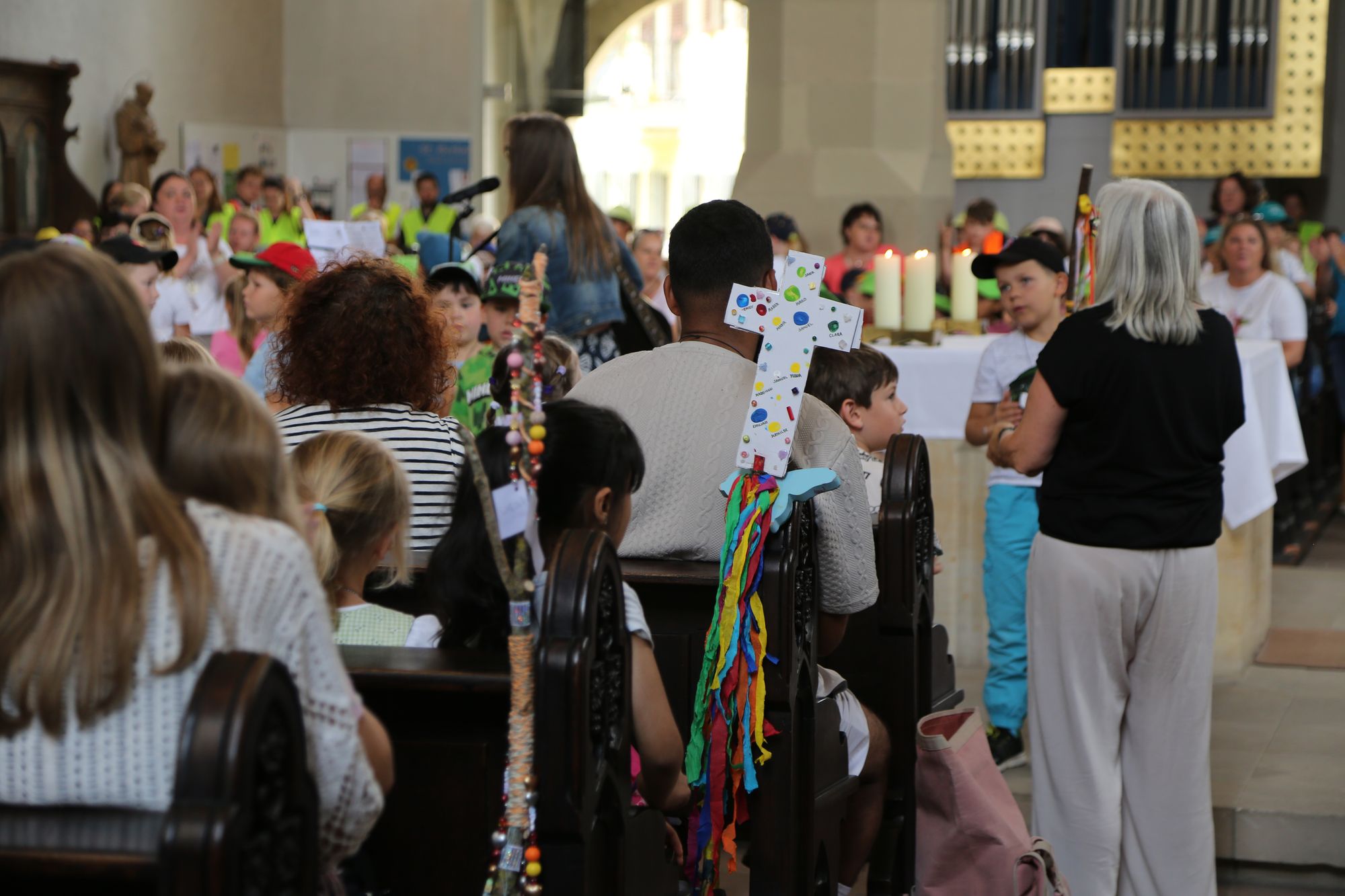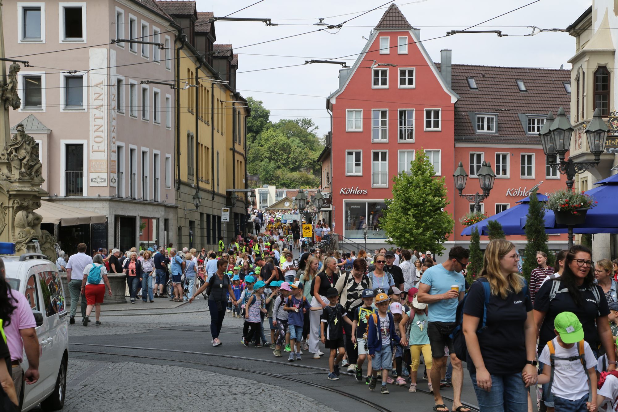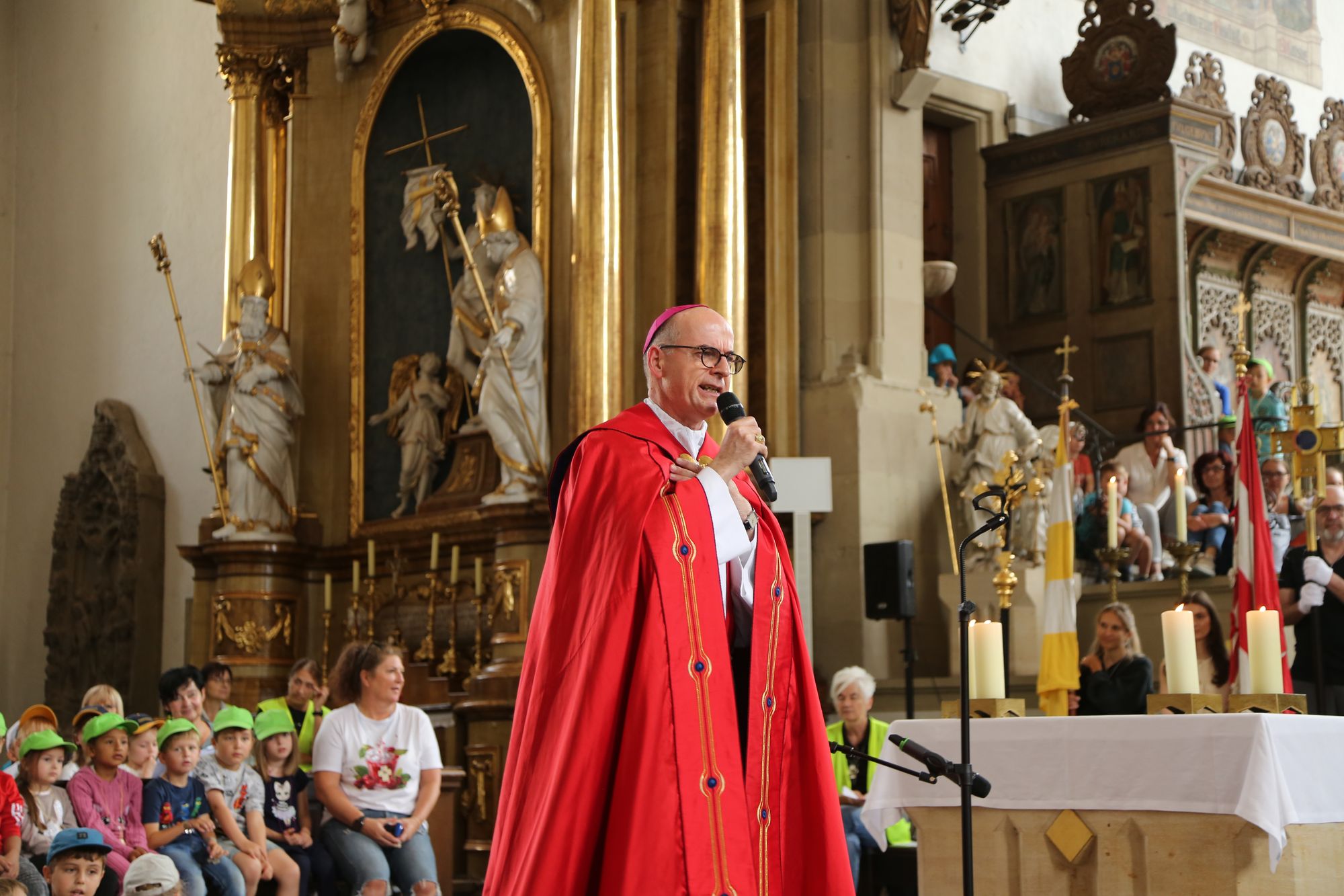 Rund 900 Kindergartenkinder haben am Freitag, 11. Juli, einen Gottesdienst mit Bischof Dr. Franz Jung in der Kirche Sankt Burkard gefeiert. Im Anschluss zogen sie über die Alte Mainbrücke in den Kiliansdom.