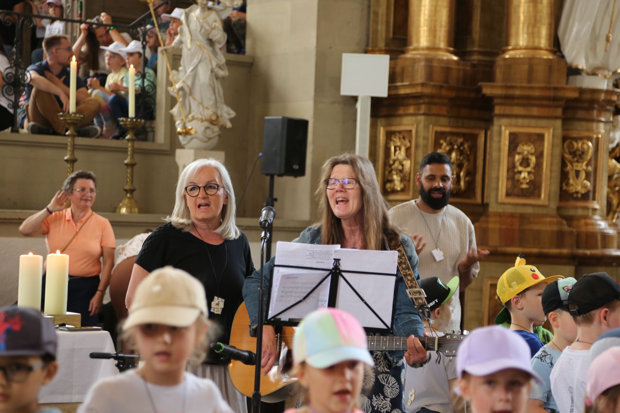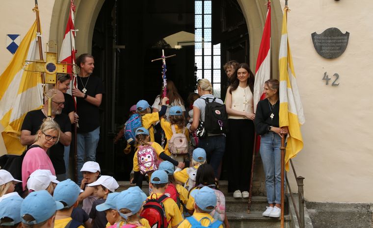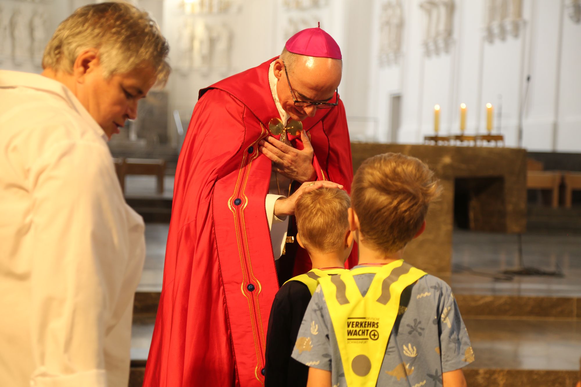 Rund 900 Kindergartenkinder haben am Freitag, 11. Juli, einen Gottesdienst mit Bischof Dr. Franz Jung in der Kirche Sankt Burkard gefeiert. Im Anschluss zogen sie über die Alte Mainbrücke in den Kiliansdom.