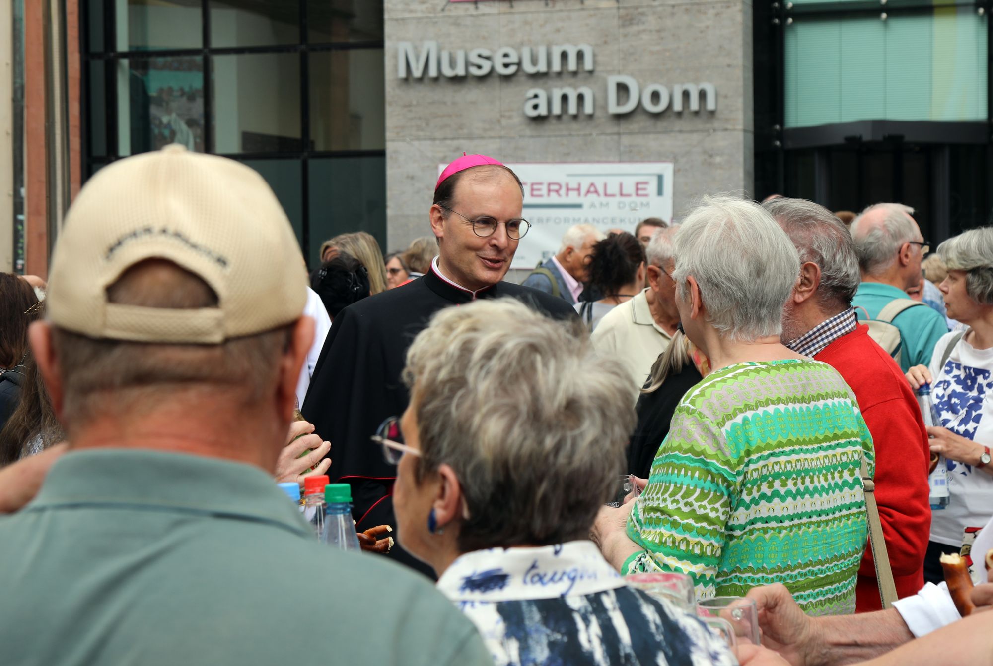 Bischof Dr. Franz Jung im Gespräch mit Wallfahrerinnen und Wallfahrern auf dem Kiliansplatz.