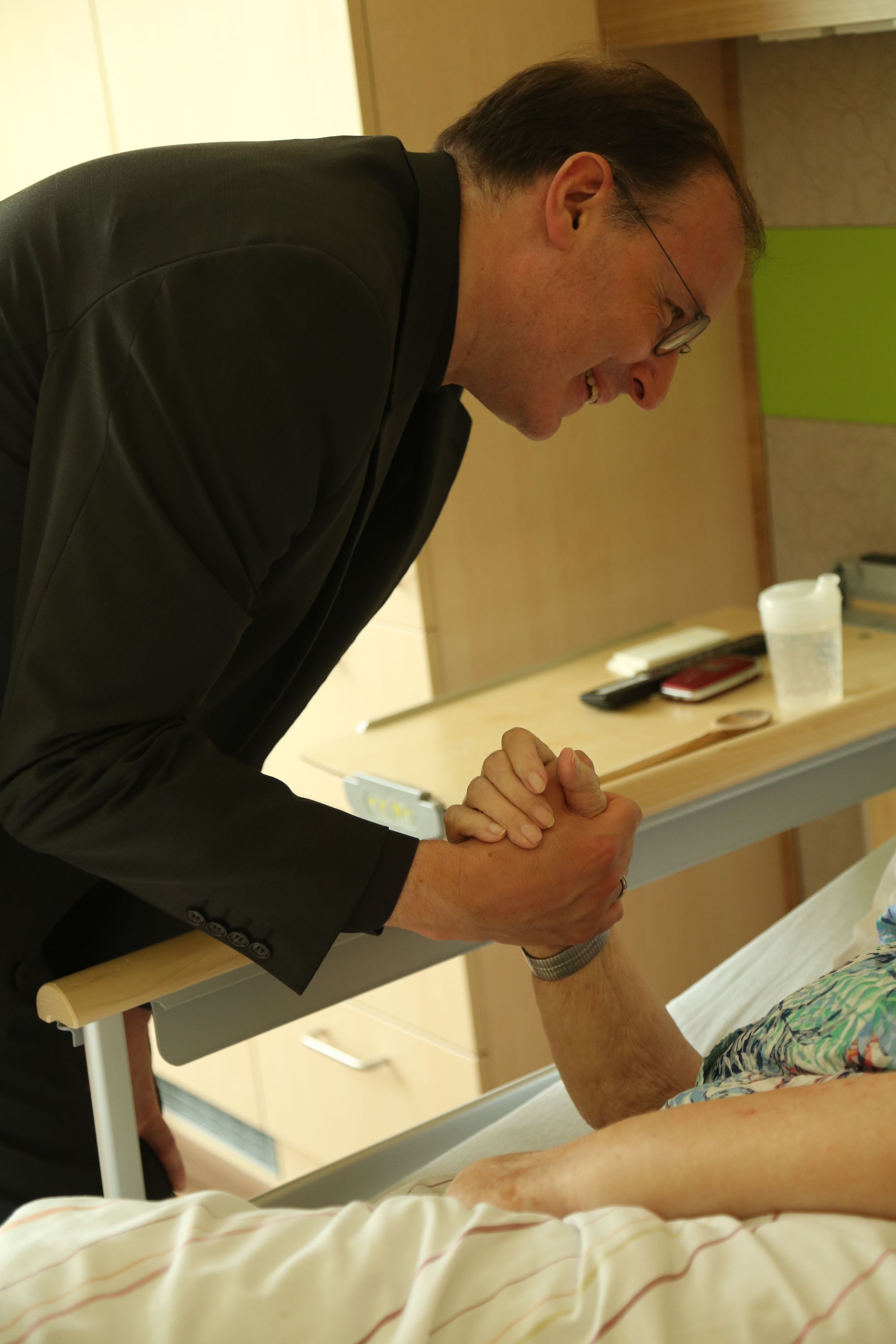 Bischof Dr. Franz Jung besuchte im Rahmen der Kiliani-Wallfahrtswoche die Palliativstation des Krankenhauses Sankt Josef. Dabei nimmt er sich viel Zeit für Besuche bei den Patientinnen und Patienten.