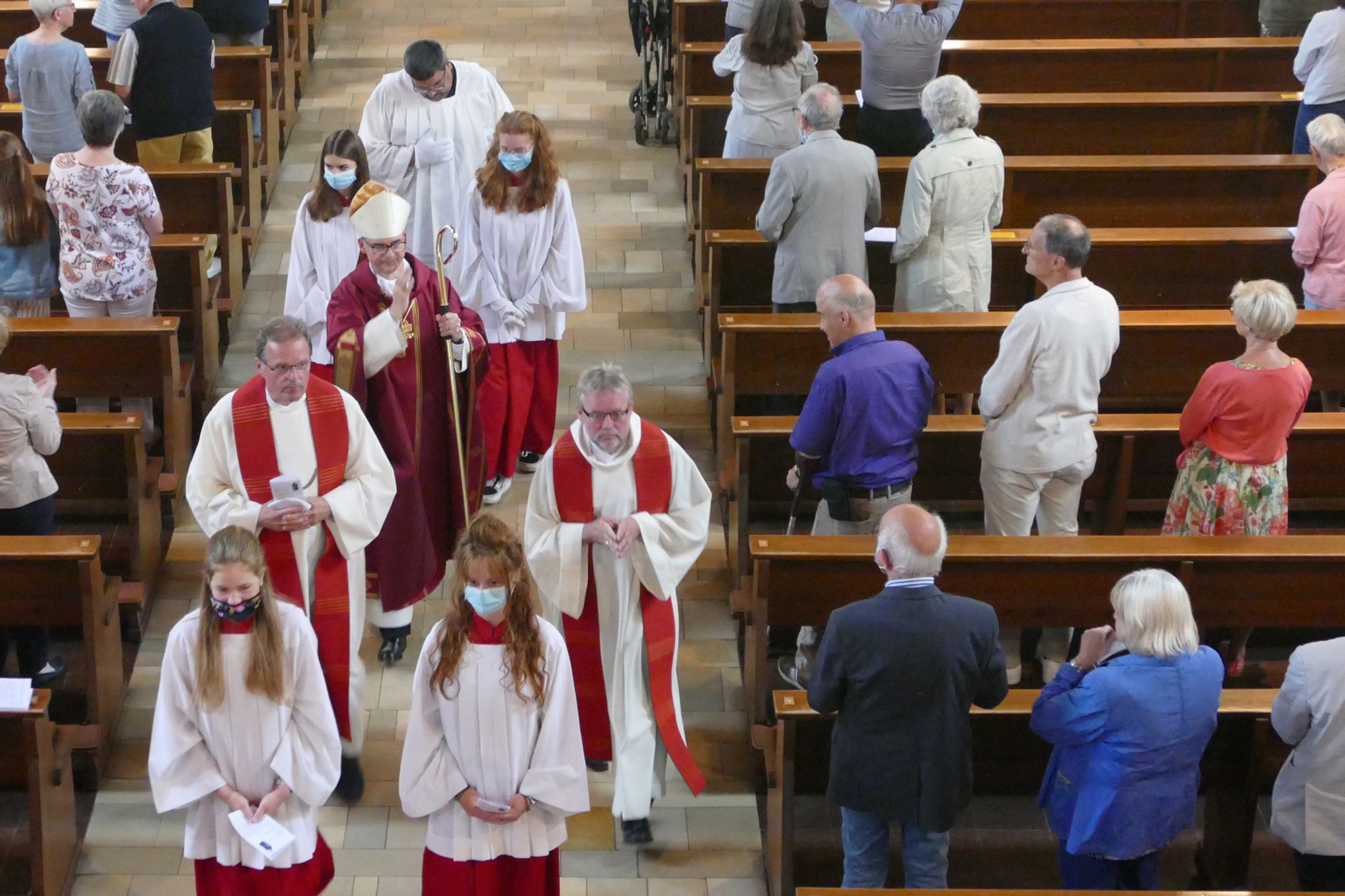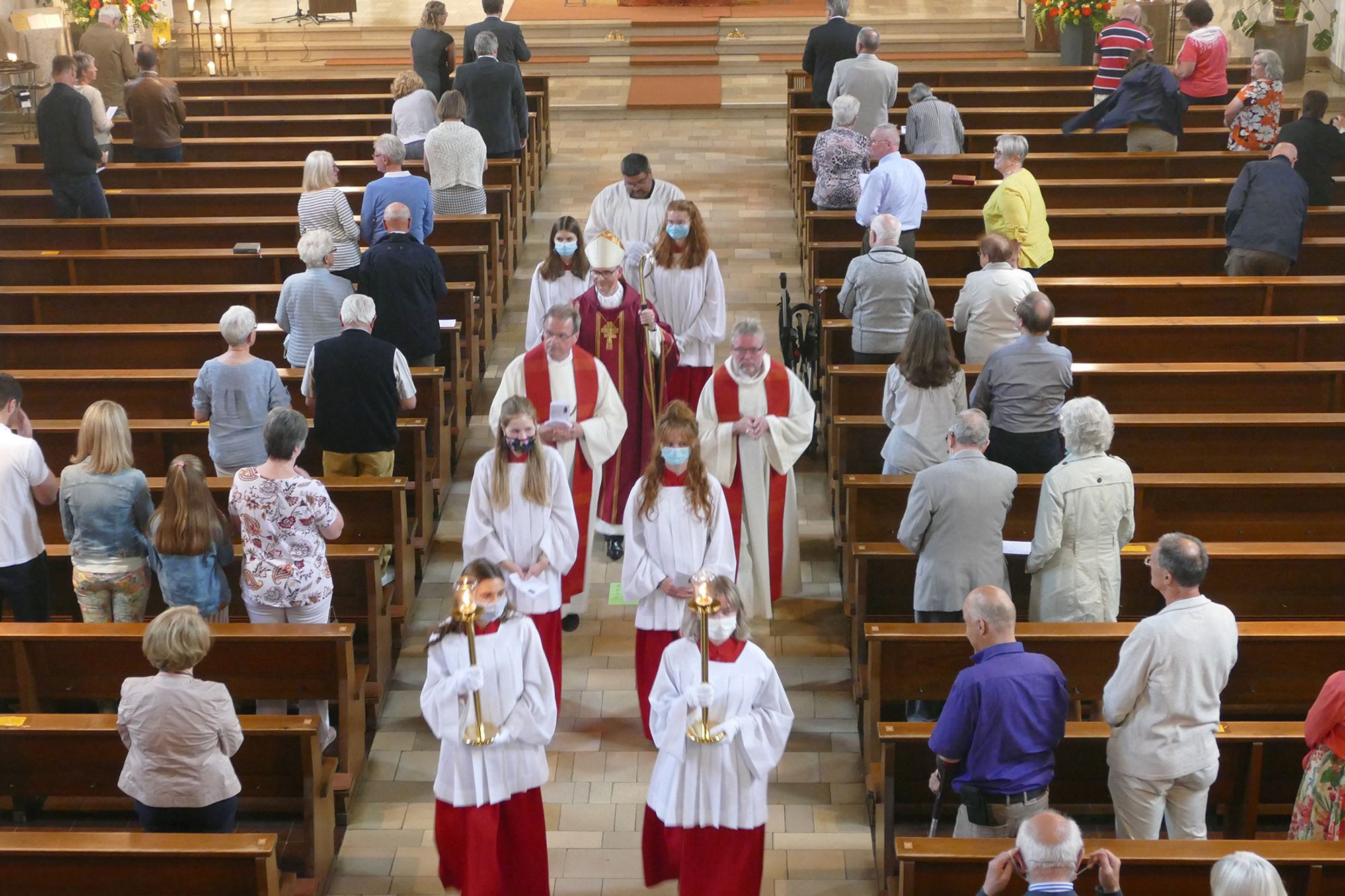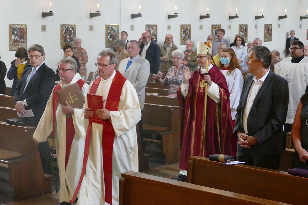 Aschaffenburg (POW) „Besondere Zeiten erfordern besondere Maßnahmen.“ So hat Pfarrer Wolfgang Kempf Bischof Dr. Franz Jung am Freitagabend, 10. Juli, in der Pfarrkirche Sankt Kilian in Aschaffenburg begrüßt. Weil die Veranstaltungen zur Kiliani-Wallfahrtswoche wegen der Corona-Schutzmaßnahmen nicht wie gewohnt stattfinden können, besuchte der Oberhirte der Diözese Würzburg im Wechsel mit Weihbischof Ulrich Boom verschiedene Kilianskirchen im Bistum, um dort mit den Menschen vor Ort Eucharistie zu feiern. Der Gottesdienst in der 1953 von Bischof Julius Döpfner geweihten Kirche war der vierte und letzte in der diesjährigen Reihe der dezentralen Kiliani-Gottesdienste. Für Bischof Jung war es der erste Besuch in dem im Aschaffenburger Stadtteil Nilkheim gelegenen Gotteshaus. Er feierte dort Gottesdienst mit Pfarrer Kempf, Pfarrer Martin Heim, Stadtdekan von Aschaffenburg, und 90 Gläubigen, darunter Landtagsabgeordneter Professor Dr. Winfried Bausback und Aschaffenburgs Oberbürgermeister Jürgen Herzing. Damit war die große Kirche aufgrund der aktuellen Hygieneregeln bis auf den letzten Platz besetzt.