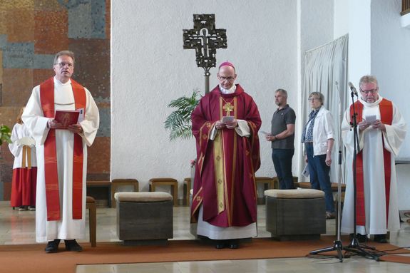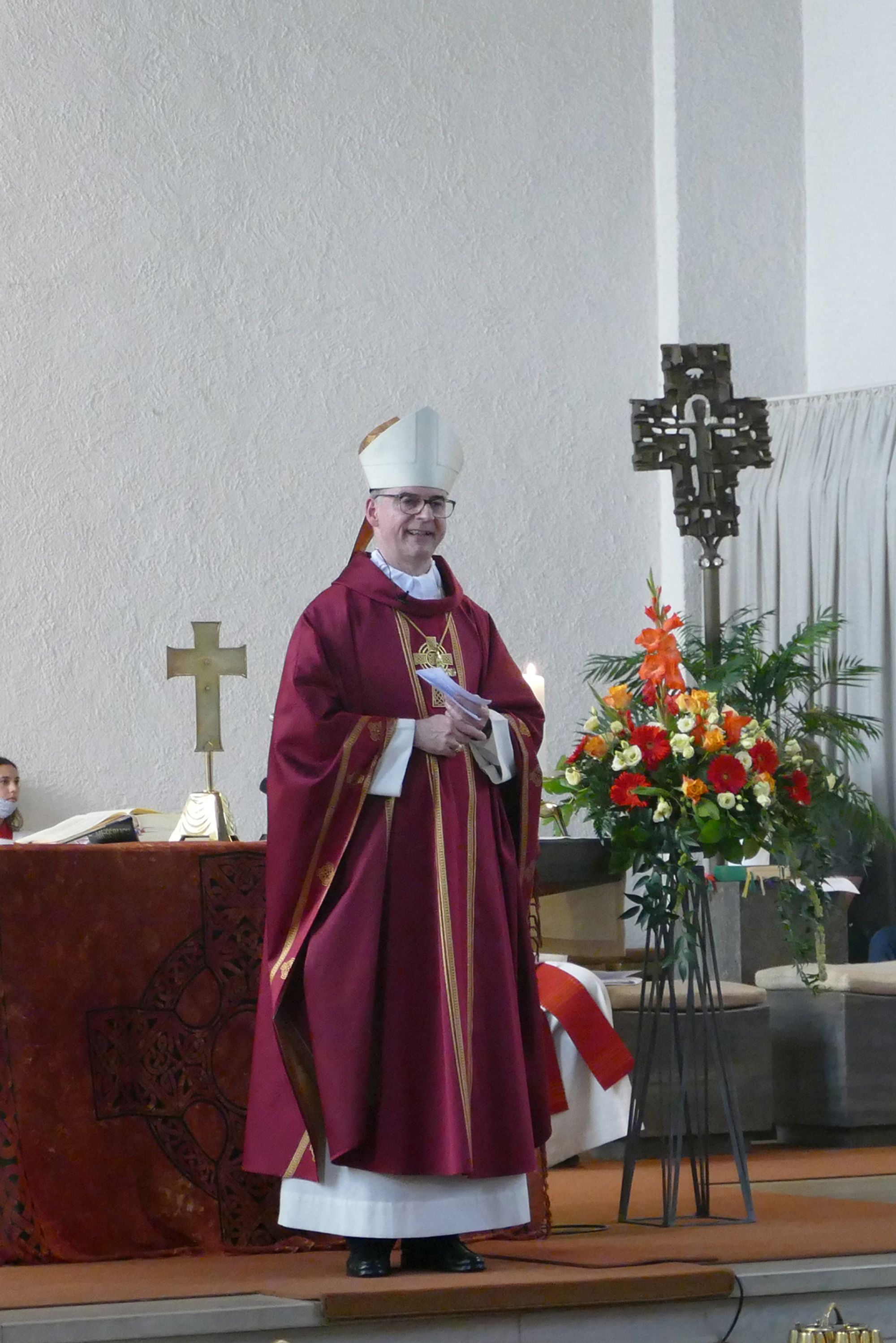 „Die Tiefe heißt, den Abgrund der eigenen Ohnmacht im Leben ermessen und das Kreuz Christi im eigenen Leben erfahren.“ Märtyrer wie die Frankenapostel hätten gezeigt, was das bedeuten könne. Die Länge schließlich deutete der Bischof als die Dimension der Zeit. Wer keine Gewalt anwende, so wie es die Bergpredigt fordere, der bringe den langen Atem mit, der für alle Veränderungen notwendig sei. Gewalt sei immer ein Ausdruck von Resignation und Hoffnungslosigkeit, wenn der Glaube fehle, die Dinge auf einem guten Weg regeln zu können. „Wir brauchen den langen Atem des Geistes Gottes für alle Veränderungen“, erklärte der Bischof. Am Ende wies er auf den Engel hin, der in der Offenbarung des Johannes mit einem goldenen Messstab die heilige Stadt Jerusalem neu vermessen soll. Der Bischof verband damit den Wunsch für die Kirche und alle Gläubigen, dass dieser heilige Engel dabei helfe, über das eigene enge Maß hinauszukommen, um die Liebe Christi zu erkennen, die jedes Maß übersteige.
