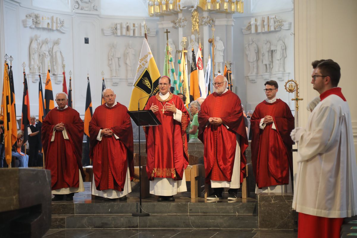 Würzburg (POW) Ein farbenfrohes Bild haben die Fahnen der Katholischen Erwachsenenverbände am Dienstagabend, 8. Juli, im Würzburger Kiliansdom geboten. Weihbischof Paul Reder feierte den Kiliani-Wallfahrtsgottesdienst mit rund 400 Frauen und Männern. „Die Fahnenabordnungen zeigen, welche Fahne Ihr hochhaltet – die Fahne der christlichen Hoffnung in einer Welt und Zeit, die oftmals so entmutigend und hoffnungslos ist“, sagte der Weihbischof in seiner Begrüßung.