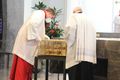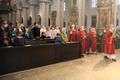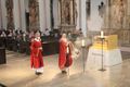 In einem kleinen szenischen Spiel reisten Ordinariatsrat Diakon Dr. Martin Faatz, Gemeindereferentin Yvonne Faatz und Religionslehrer im Kirchendienst Klaus Warmuth als Frankenapostel von Irland nach Europa. Die im Altarraum aufgestellten Weinstöcke symbolisierten ihre Ankunft in Unterfranken. Zum Abschluss des Gottesdienstes wurde der Schrein mit den Häuptern der Frankenapostel feierlich wieder im Altar des Kiliansdoms platziert.
