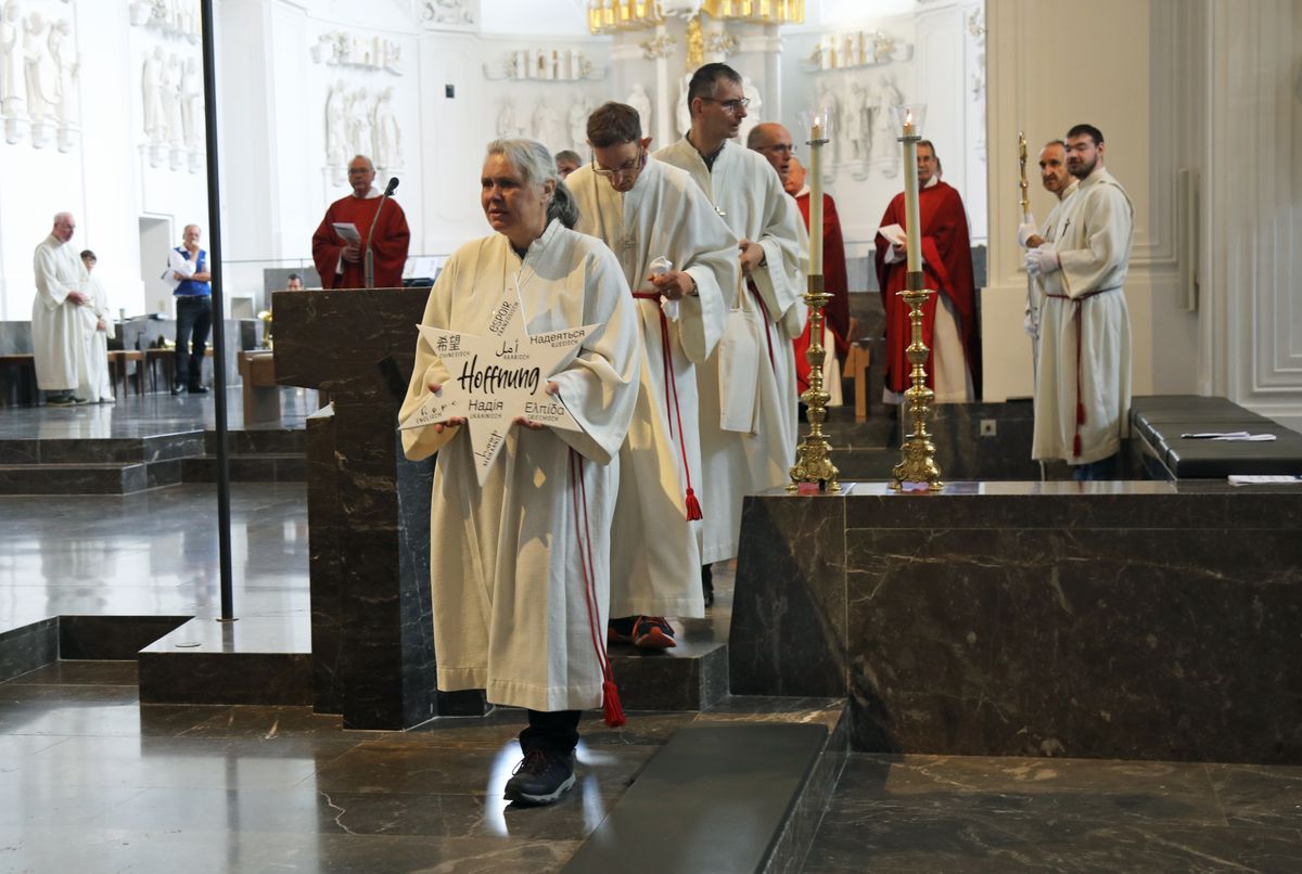 Die Fürbitten wurden von Menschen aus der Gottesdienstgemeinde vorgetragen. Darin wurde unter anderem um Zuversicht gebeten für alle, die unter den Schwächen des Alters leiden, und für alle, welche die Hoffnung verloren haben. Mitglieder der Katholischen Gehörlosen-Gemeinschaft Sankt Kilian der Diözese Würzburg trugen während der Fürbitten Hoffnungssterne an langen Stäben in den Altarraum. Auch die Gaben wurden von Menschen aus den Reihen der Gläubigen zum Altar gebracht: ein Korb voller Hoffnungssterne mit Aufschriften wie „Liebe“, „Dankbarkeit“ und „Kraft“, Weizenkörner, Brot, Weintrauben und Wein.