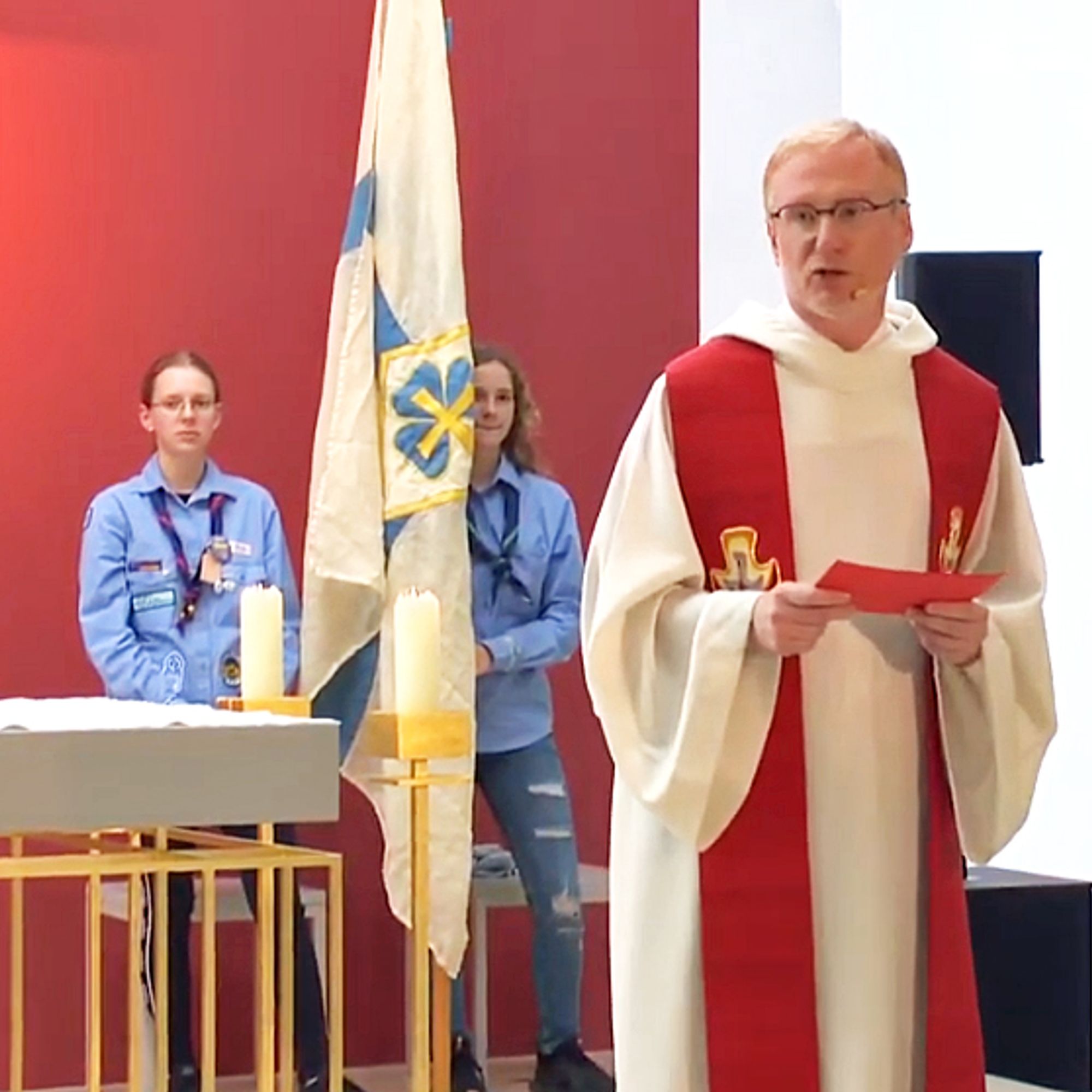 In Würzburg feierte Diözesanjugendseelsorger Stephan Schwab mit rund 30 Jugendlichen und jungen Erwachsenen ein Abendlob in der Jugendkirche im Kilianeum-Haus der Jugend. Es stand unter dem Motto „All you need is love“. „Liebe ist die Voraussetzung für ein gutes und gelingendes Leben“, erklärte Schwab den Jugendlichen und jungen Erwachsenen. Jesus habe die Menschen so angenommen, wie sie sind, und sie bedingungslos geliebt. „Die einzige Bedingung für Gottes Liebe ist die Bedingung zu lieben, die Menschen so anzunehmen wie sie sind.“ Auch Kilian und seine Gefährten hätten die Liebe Gottes erfahren und wollten diese Liebe und Freundschaft für andere erfahrbar machen, erläuterte Schwab. Weitere 700 Personen feierten das Abendlob über den Livestream auf YouTube (https://www.youtube.com/watch?v=Ljdbe8ywucU) mit. Im Anschluss boten Diözesankuratin Julia Stöhr und Petra Scheuermayer von der Pfadfinderinnenschaft Sankt Georg (PSG) im Innenhof des Kilianeums Schokobananen am Lagerfeuer an. „Wir haben sehr positive Rückmeldungen bekommen“, sagte Jugendseelsorger Sebastian Volk. Vor allem die Musik der Band habe die Teilnehmer begeistert. „Und natürlich war es schön, Leute mal wieder in echt zu treffen und sich mit Abstand zu unterhalten.“