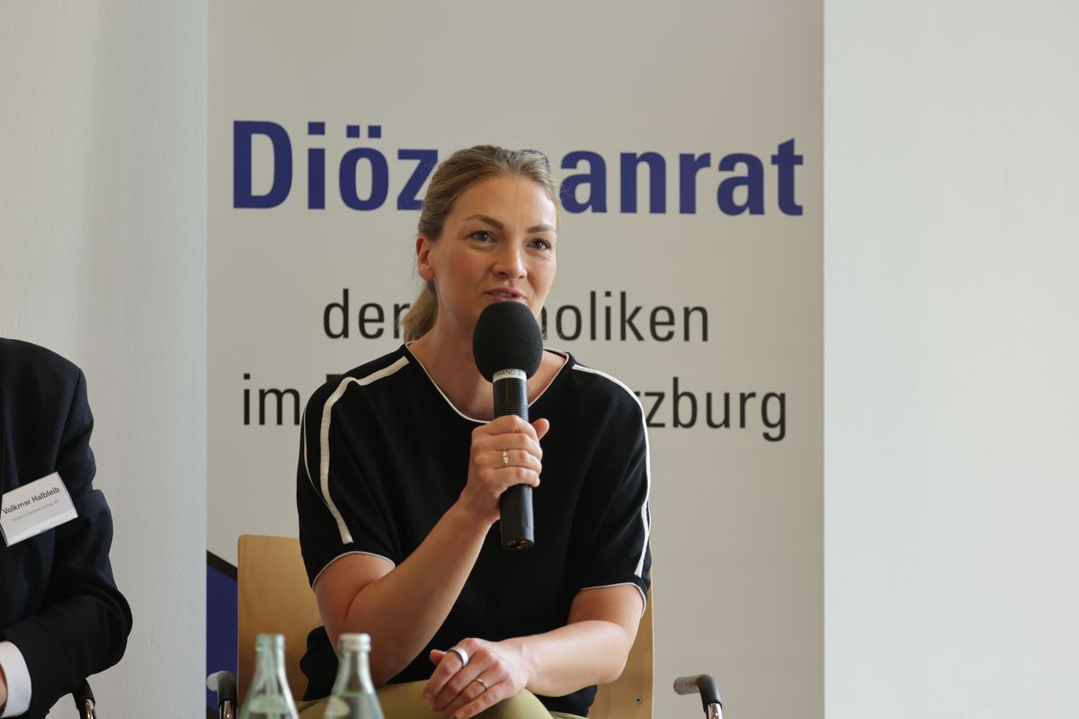 Würzburg (POW) Im Blick auf die medizinische Versorgung der Zukunft hat Judith Gerlach, bayerische Ministerin für Gesundheit, Pflege und Prävention (CSU), dafür geworben, mehr Sensibilität dafür zu entwickeln, dass das Gesundheitssystem nicht ausgenutzt werde. Nirgends besuche ein Patient so viele Fachärzte desselben Bereichs wie in Deutschland. „Dieses Ärzte-Hopping als Auswirkung der derzeitigen All-inclusive-Mentalität kann und wird nicht mehr die Realität der kommenden Jahre sein“, sagte sie am Samstag, 5. Juli, bei einer Podiumsdiskussion. Diese war Teil der Kiliani-Vollversammlung des Diözesanrats der Katholiken im Bistum Würzburg im Würzburger Burkardushaus. Thema des Gesprächs waren die Sorgen und Nöte der medizinischen und pflegerischen Versorgung in Unterfranken. Die Ministerin lobte bei der Gelegenheit die umfangreiche und gute Beratungsarbeit der Kirche. „Es ist wichtig, dass wir auch die pflegenden Angehörigen im Blick haben. Denn die sind oft platt und fertig“, sagte Gerlach.