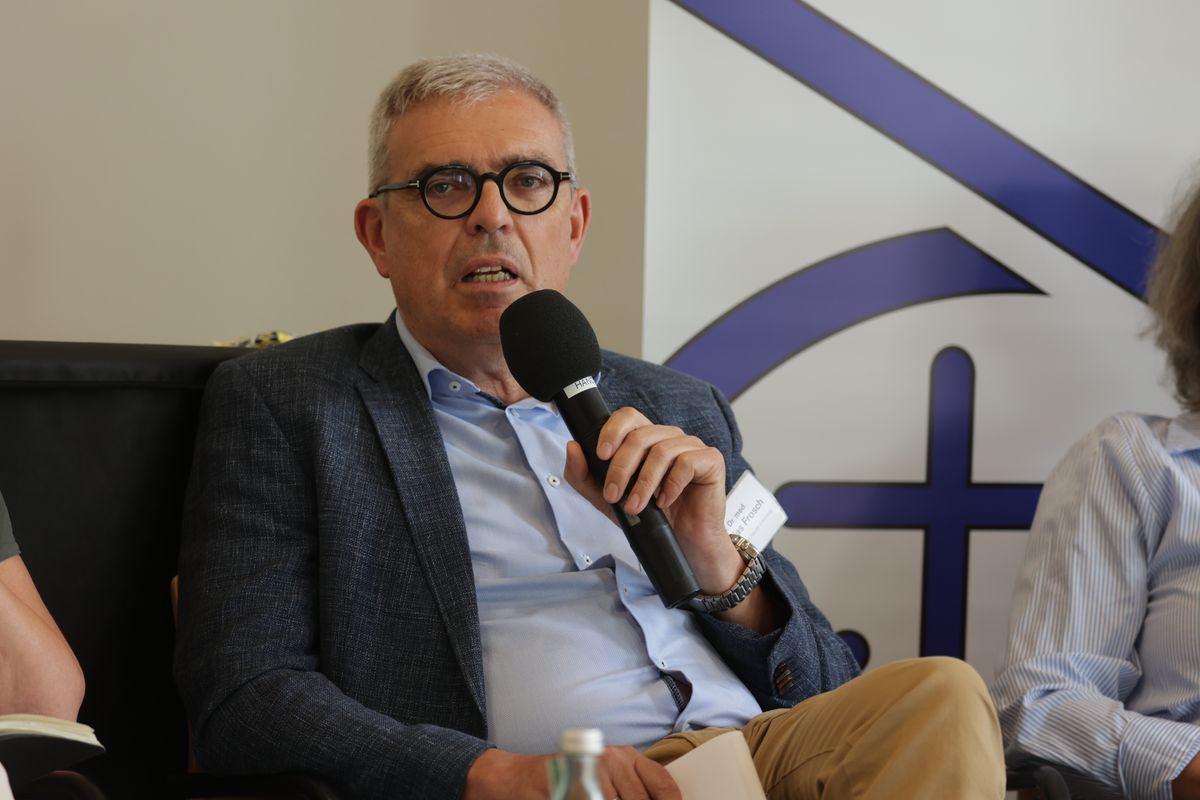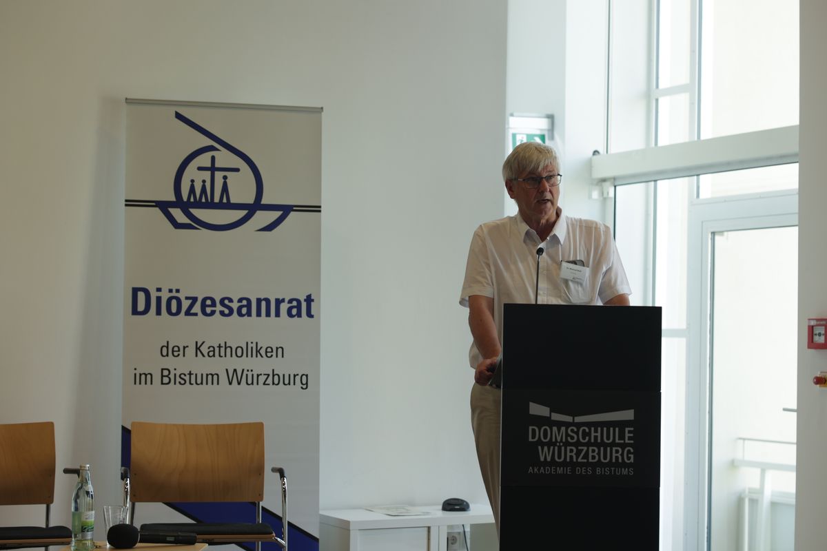 Verschiedene Aspekte des Themas griff das Podium bei der anschließenden Diskussion auf. Weder in der vollständigen Ökonomisierung des Gesundheitssystems wie in den USA noch in der kompletten Verstaatlichung wie in Großbritannien sah Diözesanratsvorsitzender Dr. Michael Wolf eine wirkliche Lösung. Zudem warnte er davor, in Künstlicher Intelligenz den Stein der Weisen für viele Probleme der Gesundheitsversorgung zu sehen. „Nicht jedes Problem ist ein Nagel, nur weil ich einen Hammer besitze.“ Professor Dr. Matthias Frosch, Dekan der medizinischen Fakultät der Universität Würzburg, nannte es bedenklich, dass mehr als ein Drittel der Bevölkerung laut Umfragen sich nicht mehr gerecht medizinisch versorgt fühle. „Das ist eine echte Gefahr für unsere Demokratie.“ Er hieß die Akademisierung der Pflege willkommen. Das bedeute, dass dadurch das Pflegepersonal auch für Aufgaben qualifiziert werde, die bislang nur Medizinern vorbehalten seien.
