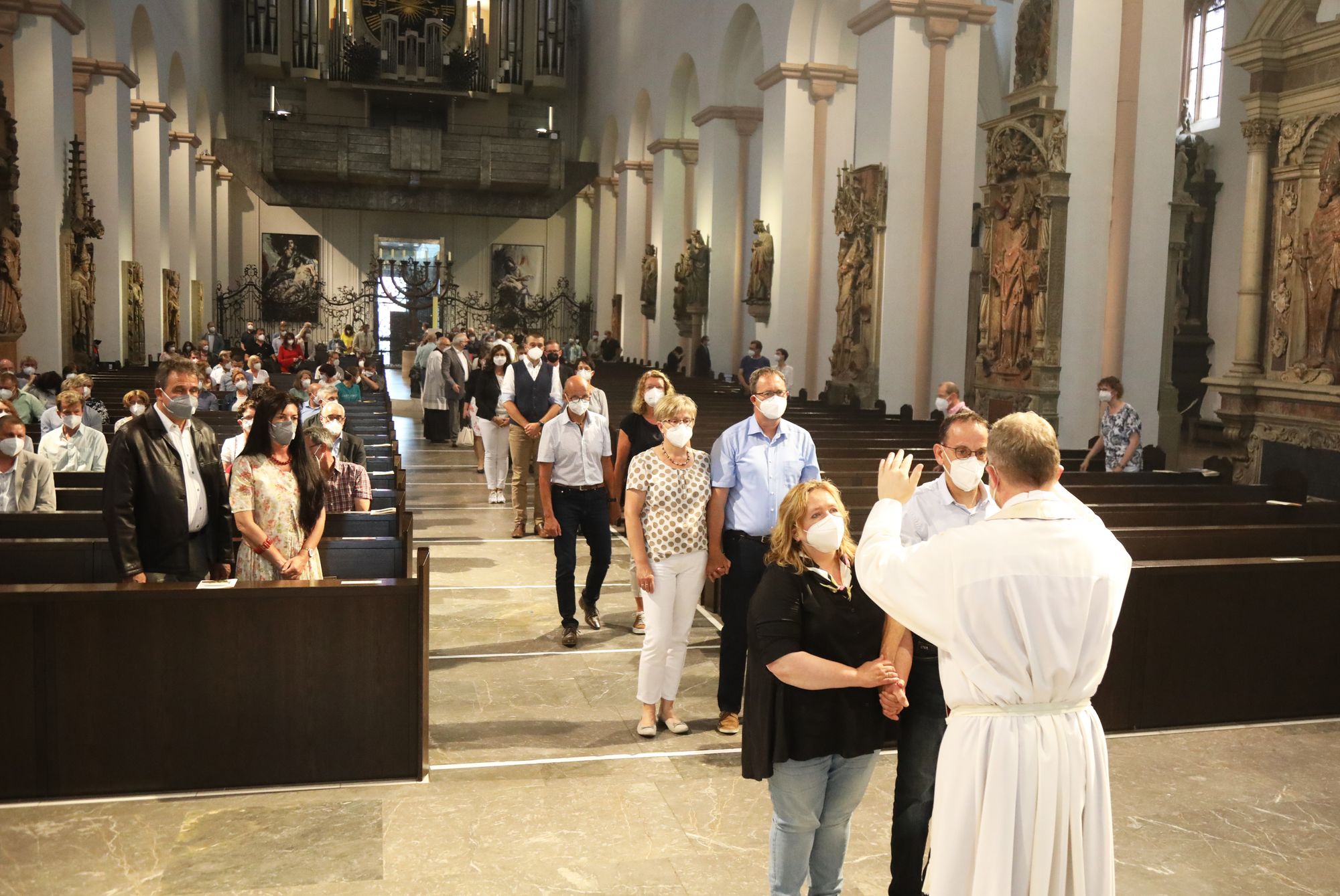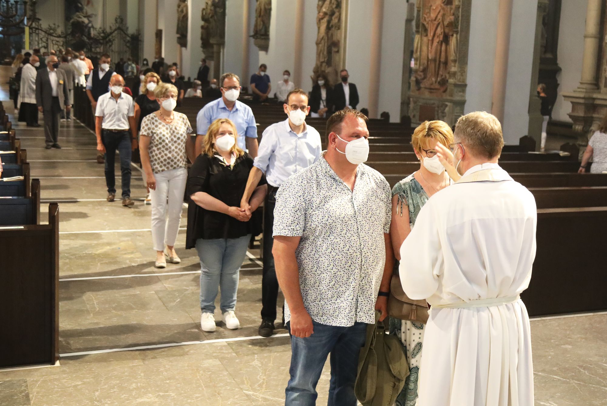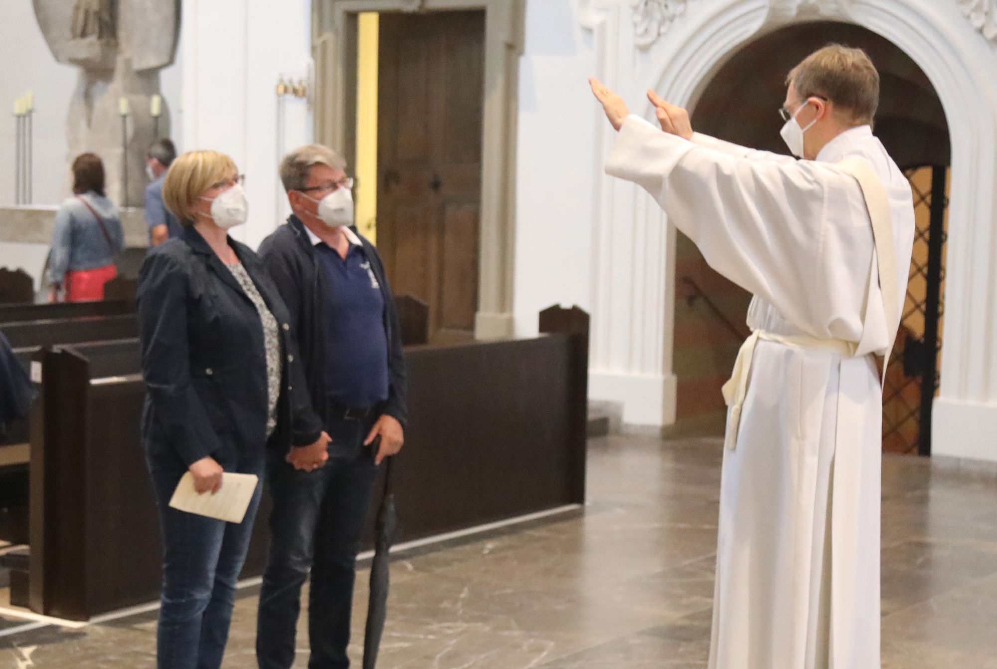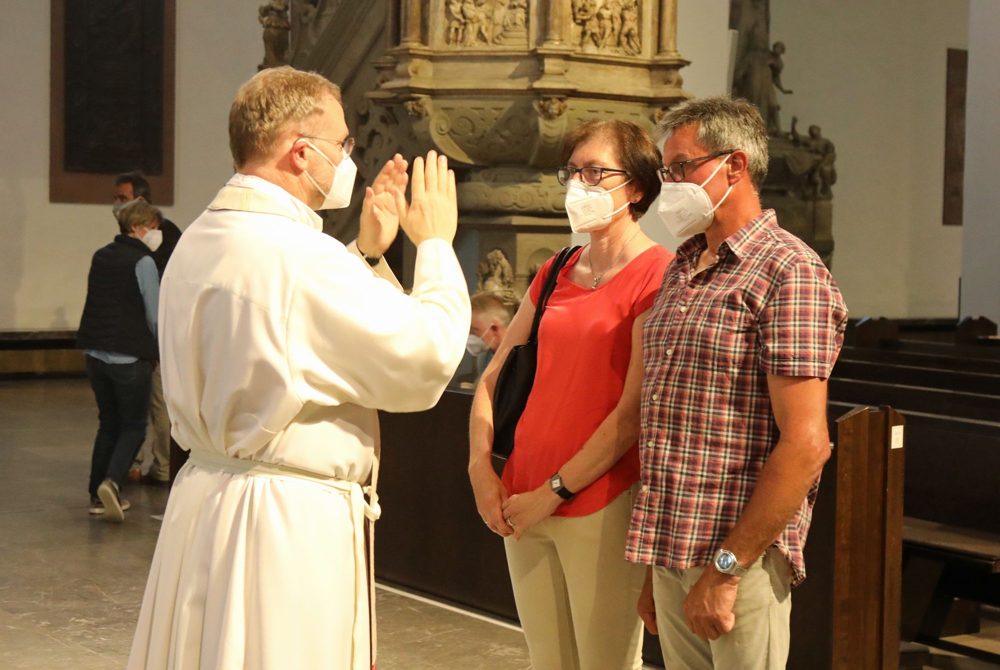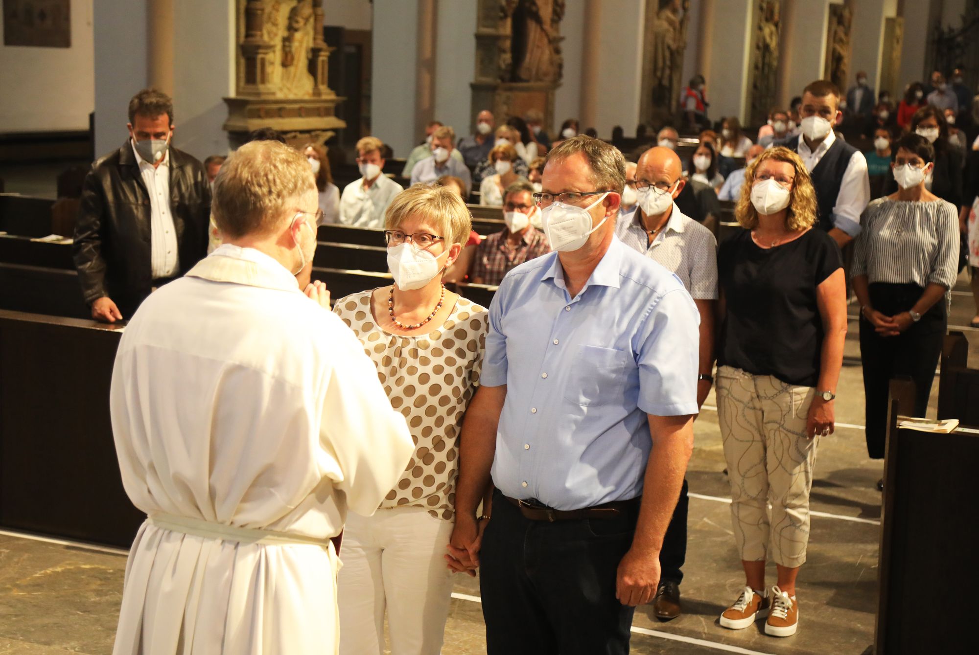 Der Festgottesdienst für Ehejubilare war der sechste von insgesamt 18, die der diesjährigen Kiliani-Wallfahrtswoche vorgeschaltet sind. Gemeinsam erneuerten die Jubelpaare im Dom ihr Eheversprechen. Nach dem Gottesdienst ließen sich die Ehepartner von Generalvikar Vorndran, Domkapitular Dompfarrer Stefan Gessner sowie weiteren Priestern, darunter die Diakone Franz Huth und Thomas Wolf, mit Abstand segnen. Die traditionelle Begegnung auf dem Kiliansplatz im Anschluss an den Gottesdienst musste aufgrund der Coronapandemie entfallen.