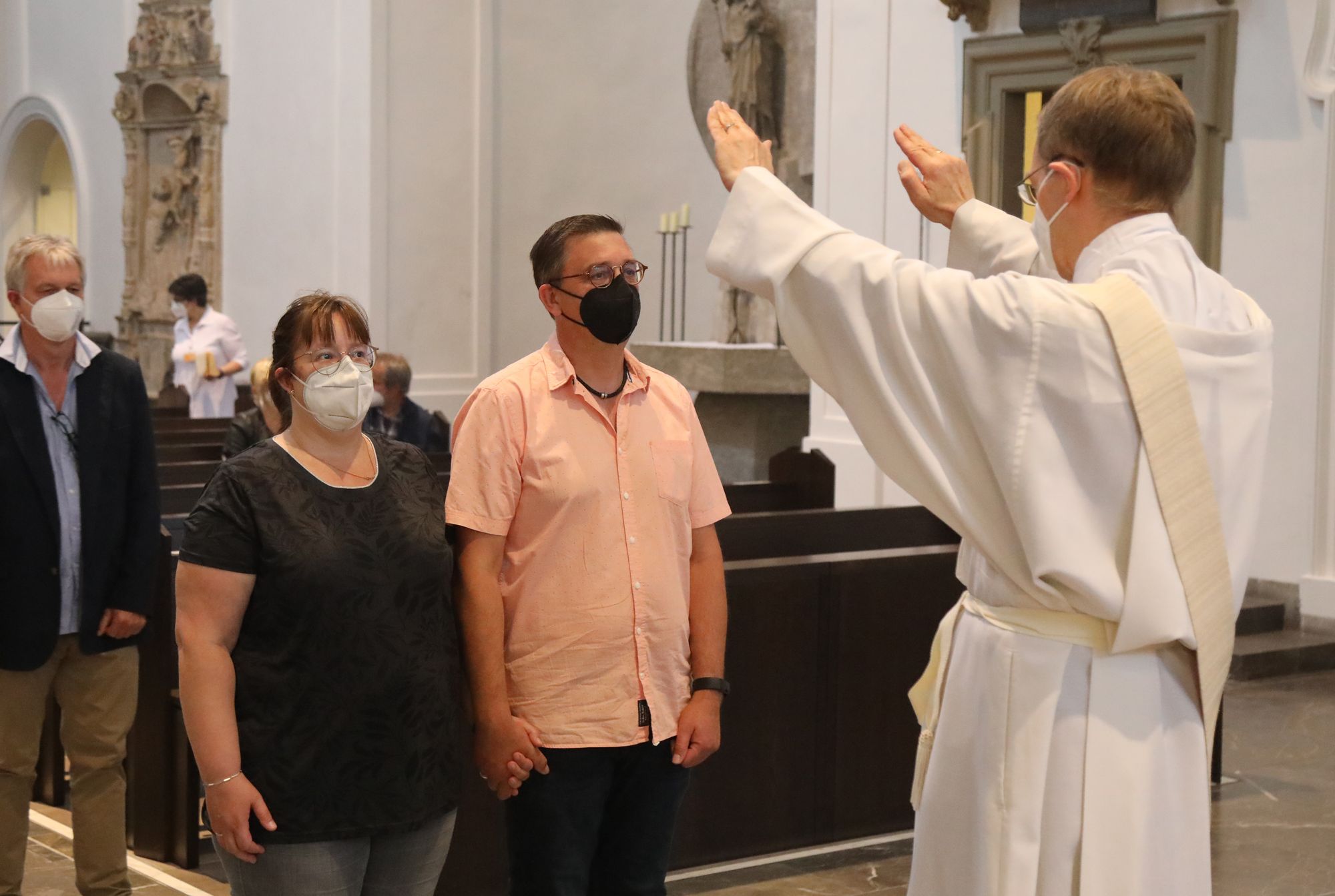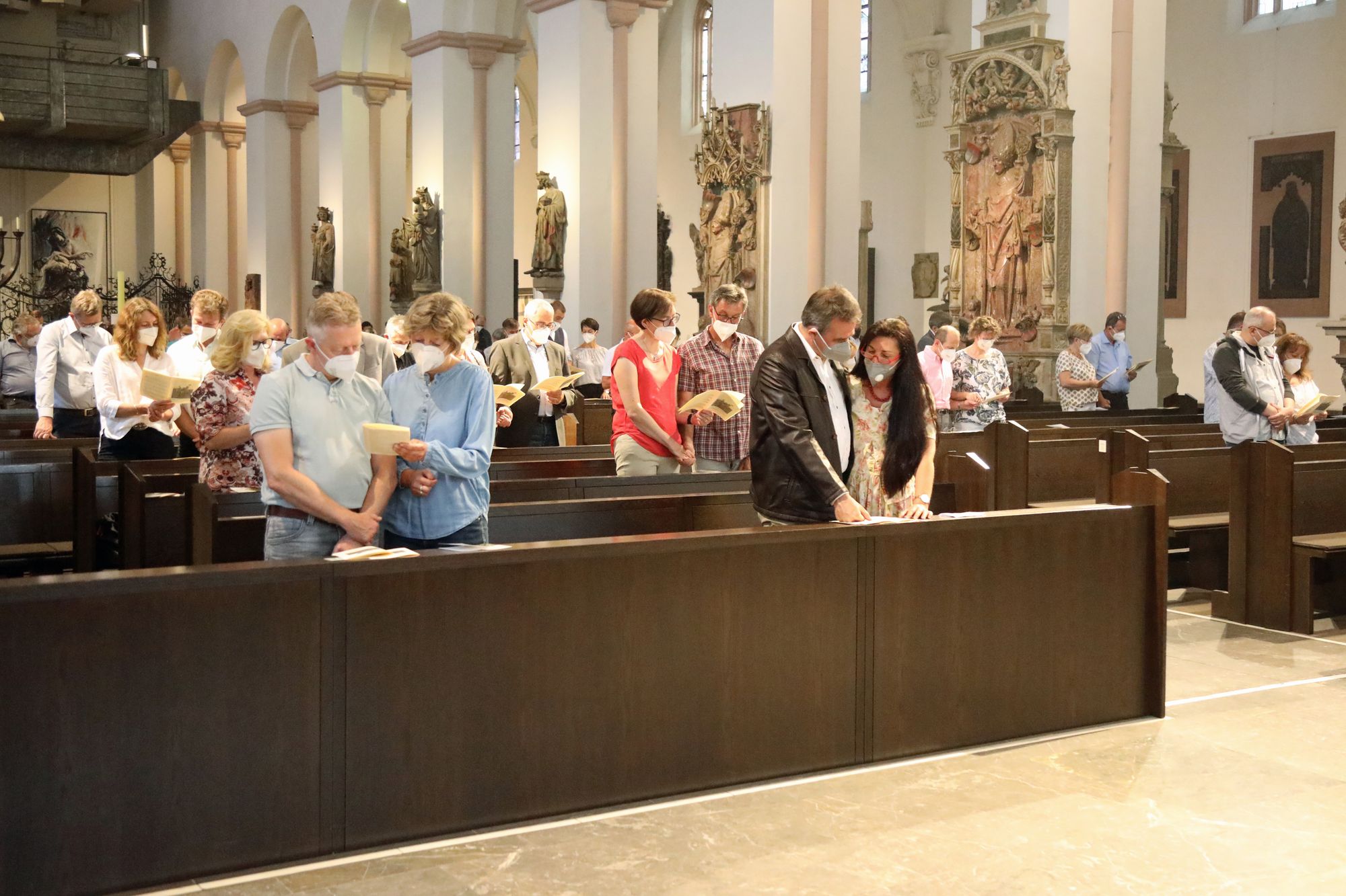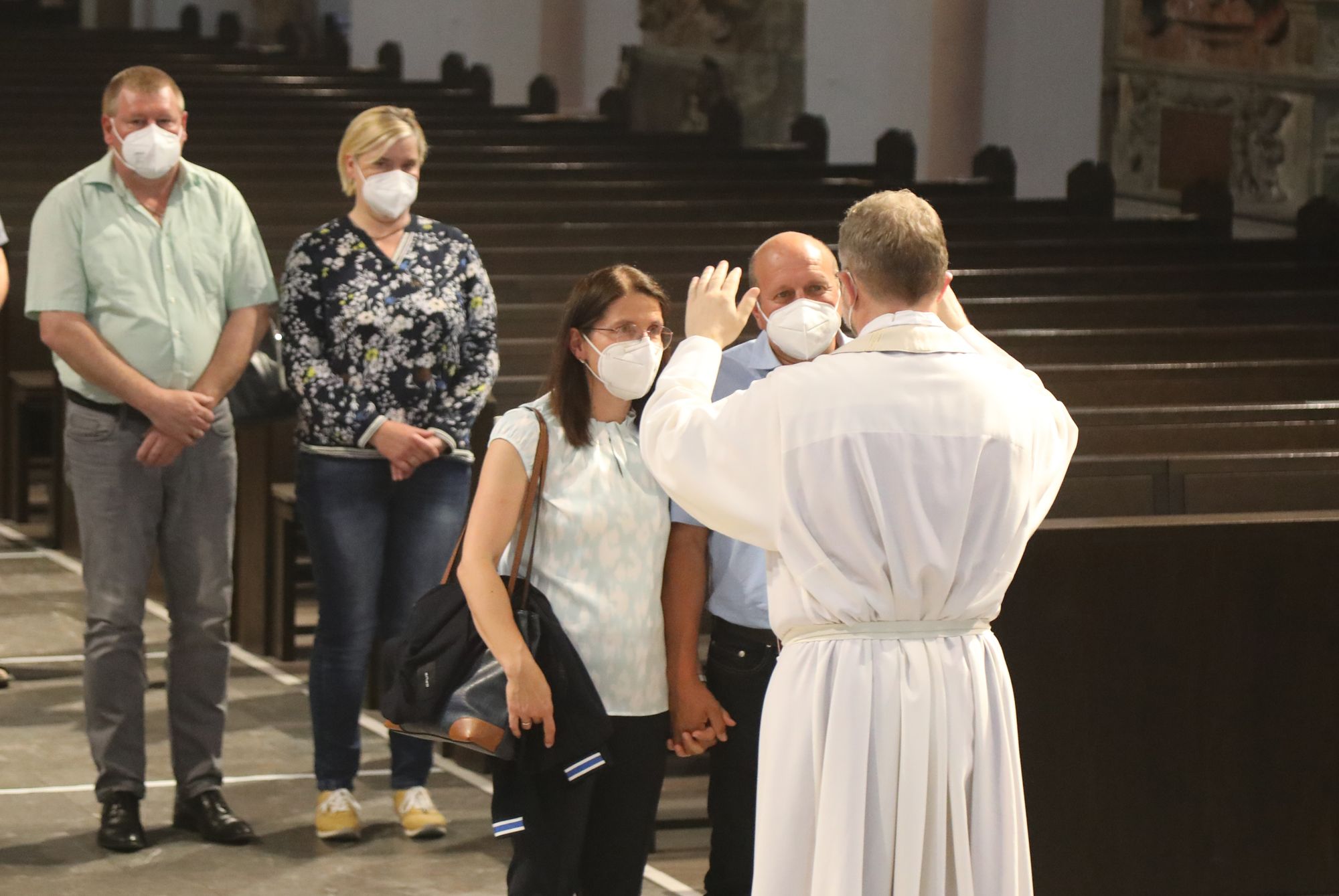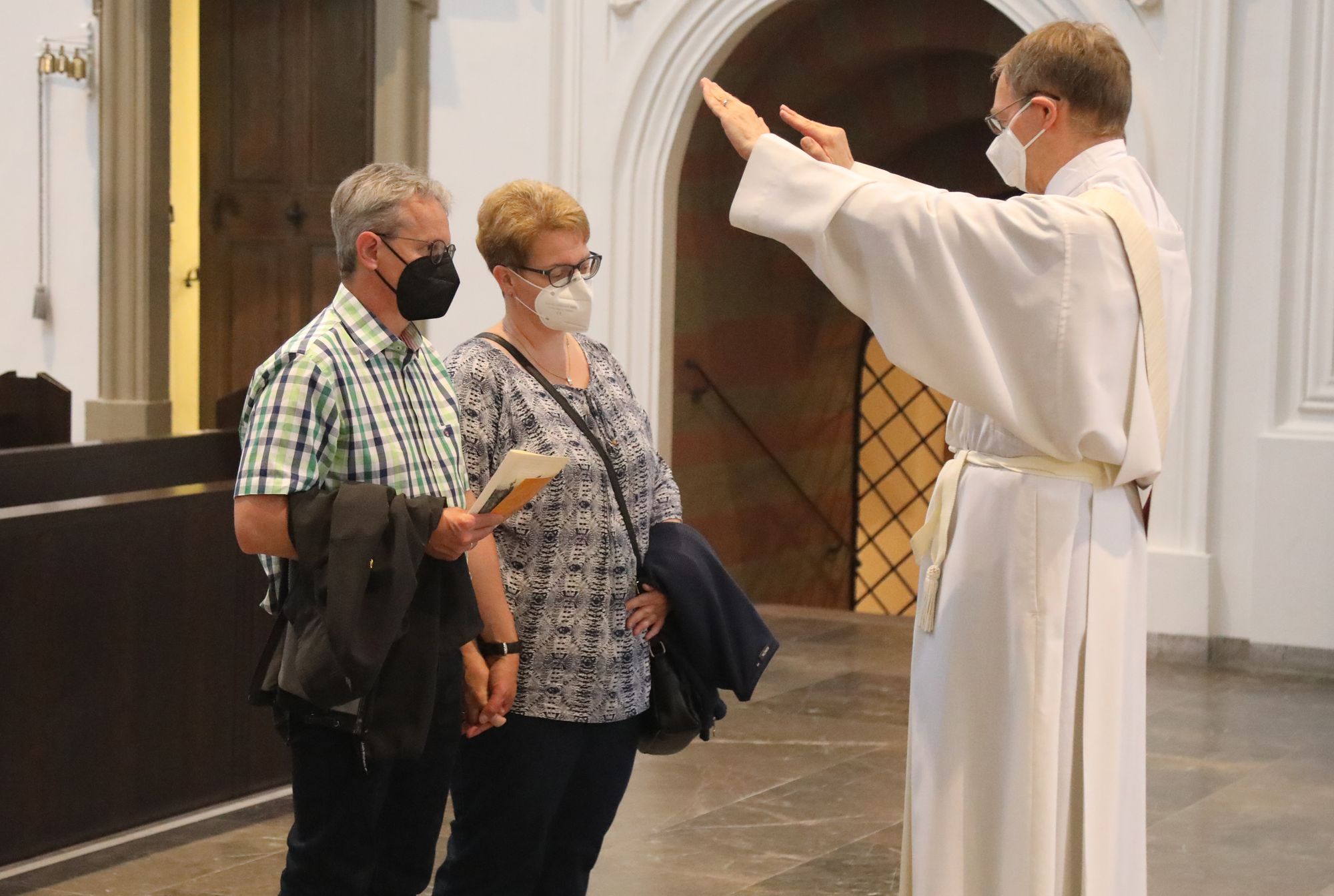 Der Festgottesdienst für Ehejubilare war der sechste von insgesamt 18, die der diesjährigen Kiliani-Wallfahrtswoche vorgeschaltet sind. Gemeinsam erneuerten die Jubelpaare im Dom ihr Eheversprechen. Nach dem Gottesdienst ließen sich die Ehepartner von Generalvikar Vorndran, Domkapitular Dompfarrer Stefan Gessner sowie weiteren Priestern, darunter die Diakone Franz Huth und Thomas Wolf, mit Abstand segnen. Die traditionelle Begegnung auf dem Kiliansplatz im Anschluss an den Gottesdienst musste aufgrund der Coronapandemie entfallen.