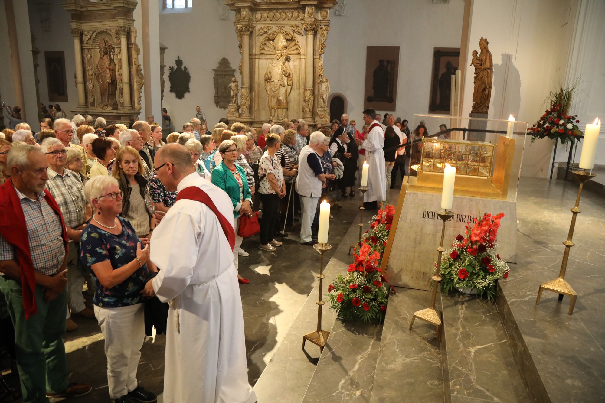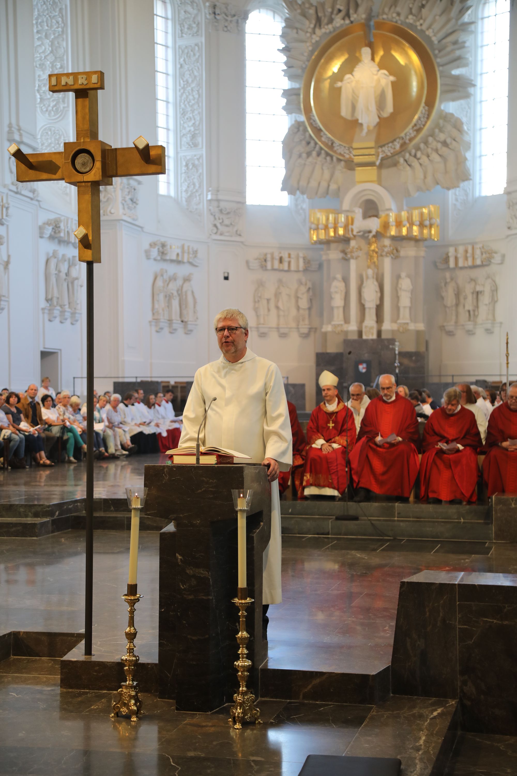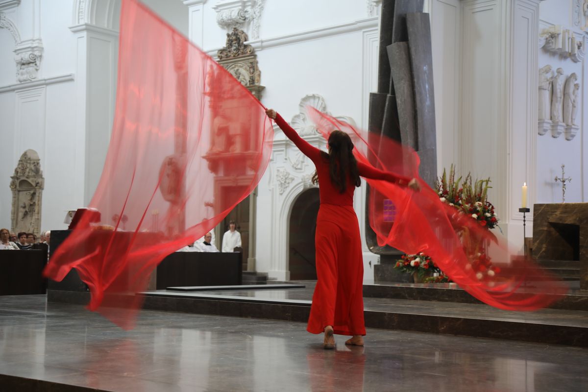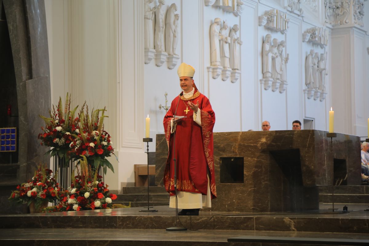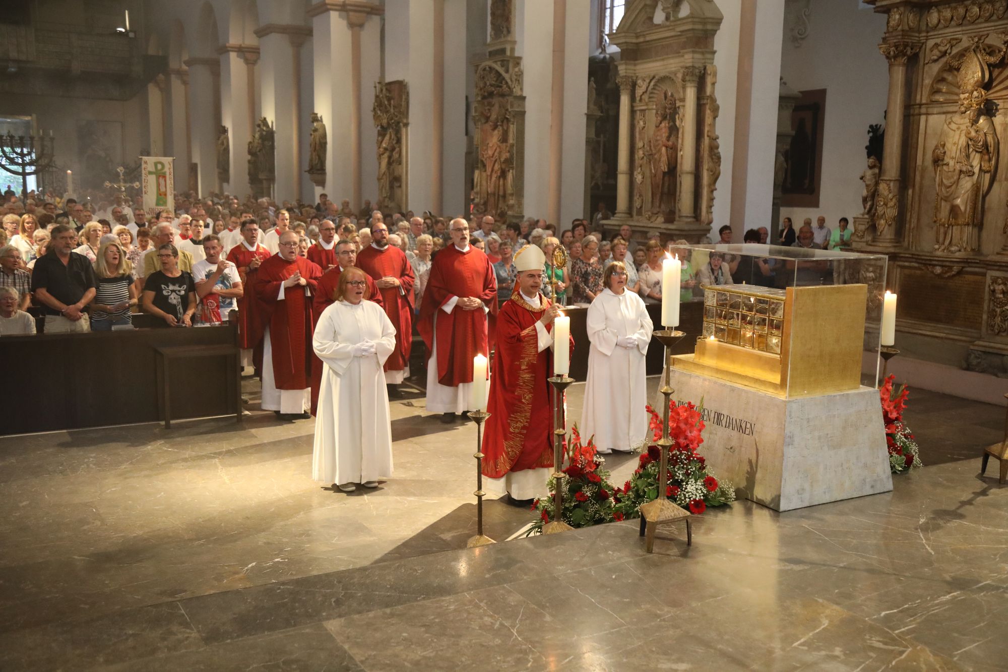 Würzburg (POW) Mit rund 1200 Frauen und Männern aus dem gesamten Bistum Würzburg, die sich als Gottesdiensthelfer engagieren, hat Bischof Dr. Franz Jung am Mittwochabend, 10. Juli, einen Kiliani-Wallfahrtsgottesdienst im Würzburger Kiliansdom gefeiert. „Ich danke Ihnen, dass Sie mit Ihrem vielfältigen Einsatz zum Gelingen der Gottesdienste in unserem Bistum beitragen“, sagte der Bischof. Der feierliche Gottesdienst begann am Taufbecken in der Mitte des Doms mit einer Tauferinnerung. Ein weiteres besonderes Element war der von einem liturgischen Tanz von Ruth Weisel begleitete Psalm vor dem Evangelium.